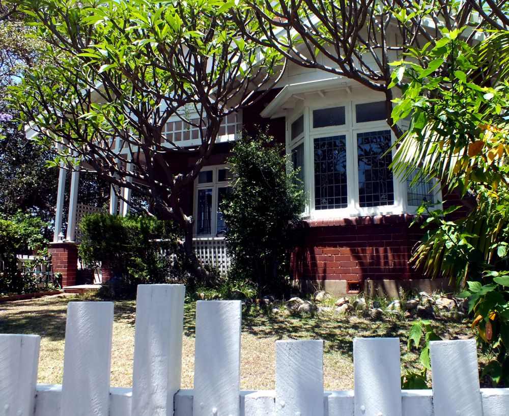 The grey and white decoration on this house (California Bungalow?) is perfectly framed by this wonderful gum tree with its peeling grey bark revealing a chalk-white trunk. Even the white lilies match. And just look at that fretwork above the windows!