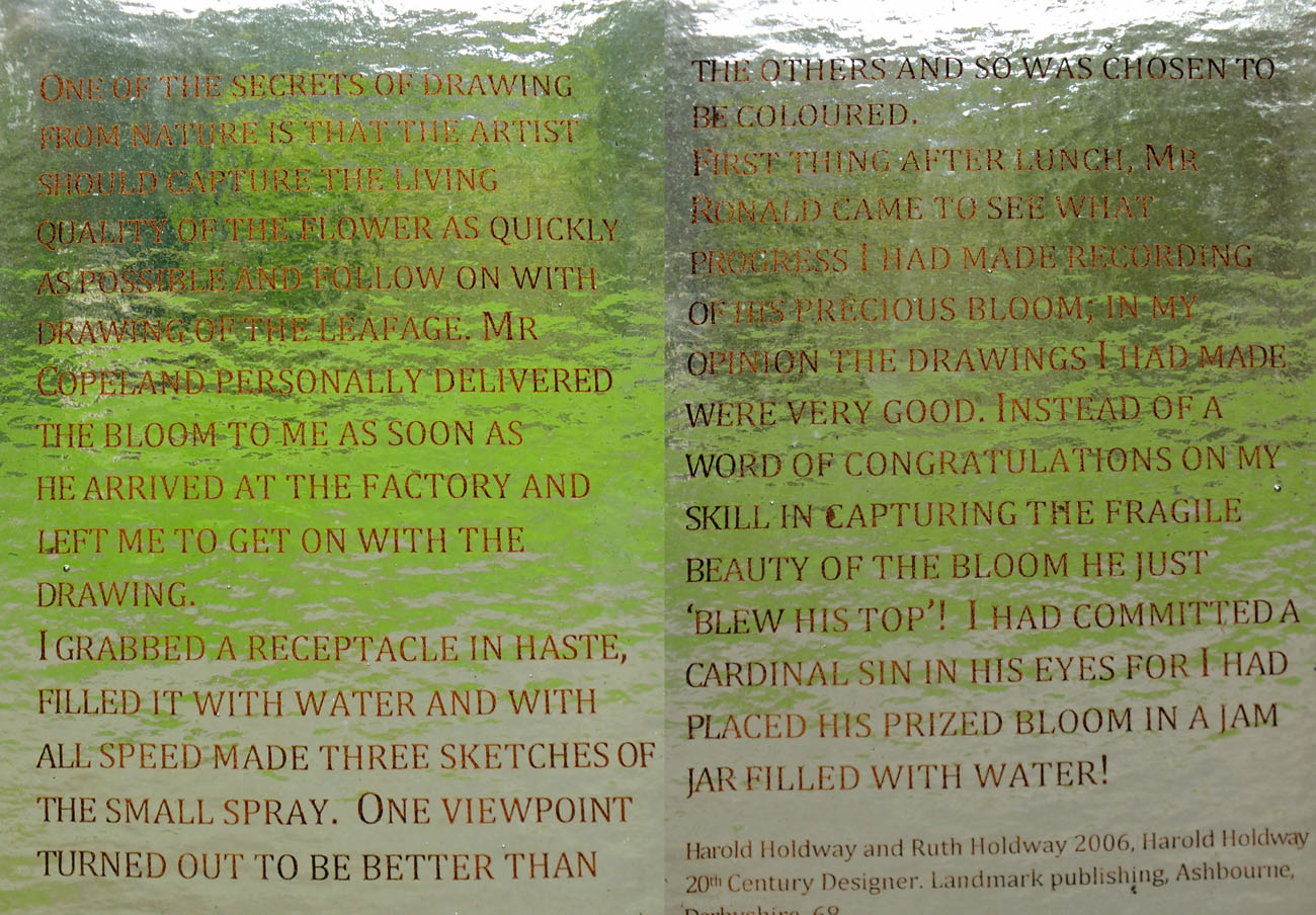The rhododendron, “Taurus” window celebrates Ronald Copeland’s passion for rhododendrons and retells a story told by Harold Holdway, chief designer at the Copeland factory in Stoke. Mr Copeland took his prized rhododendrons from Trelissick and had Harold Holdway create designs from them for a Botanical series.