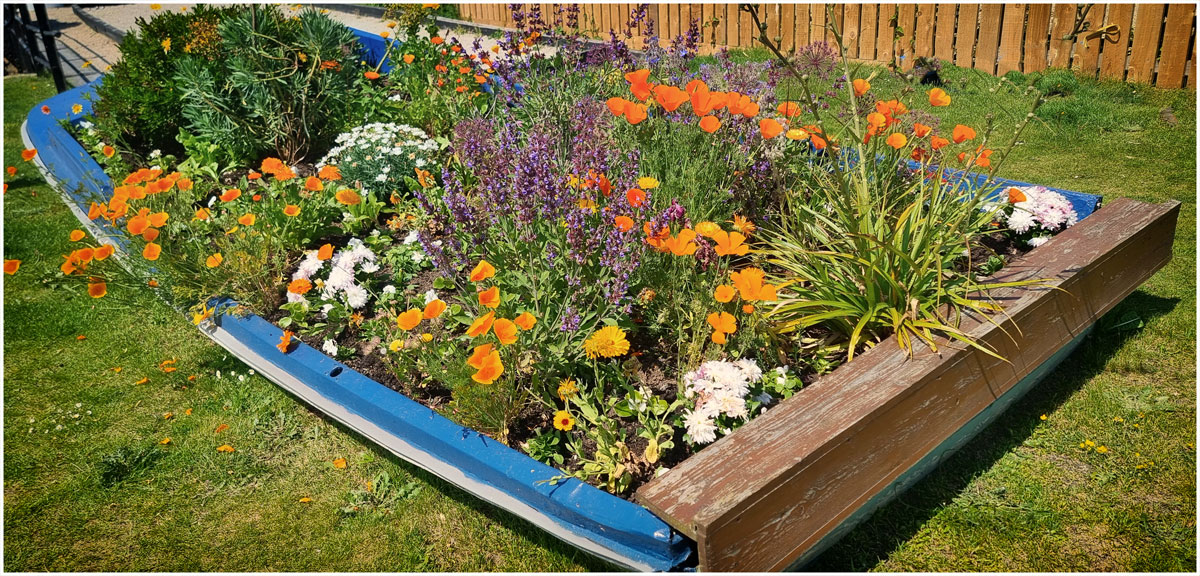 Flower-filled boat with room to perch