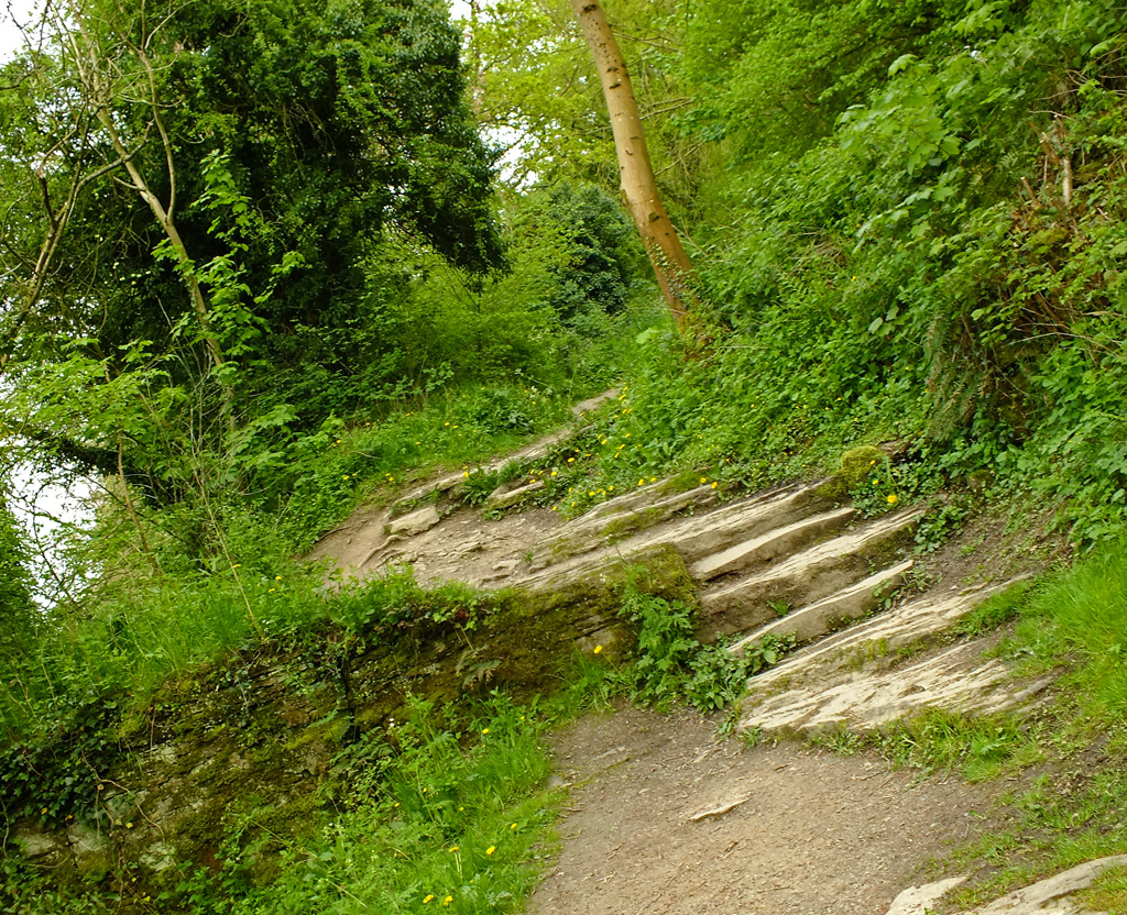 As we reach the end of the walk there are two pathways leading up to Whitcliffe common. Packhorse Path known locally as the Donkey Steps, climbs steeply ahead of you through the woods. So called from the long-established folk tradition that it was used by packhorses to carry ore from the Clee Hills to the ironworks at Burrington.