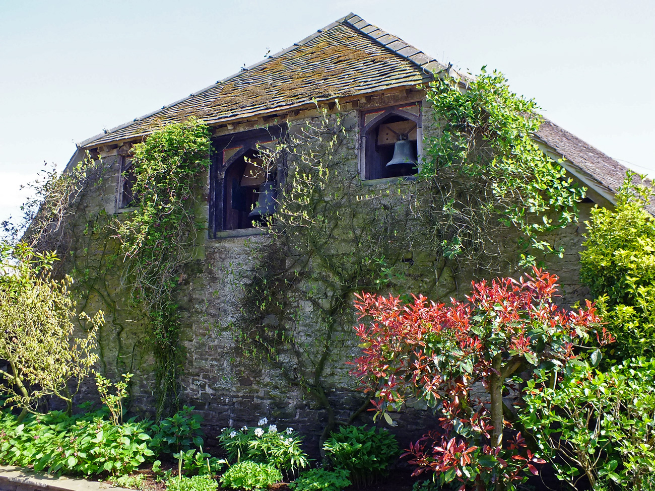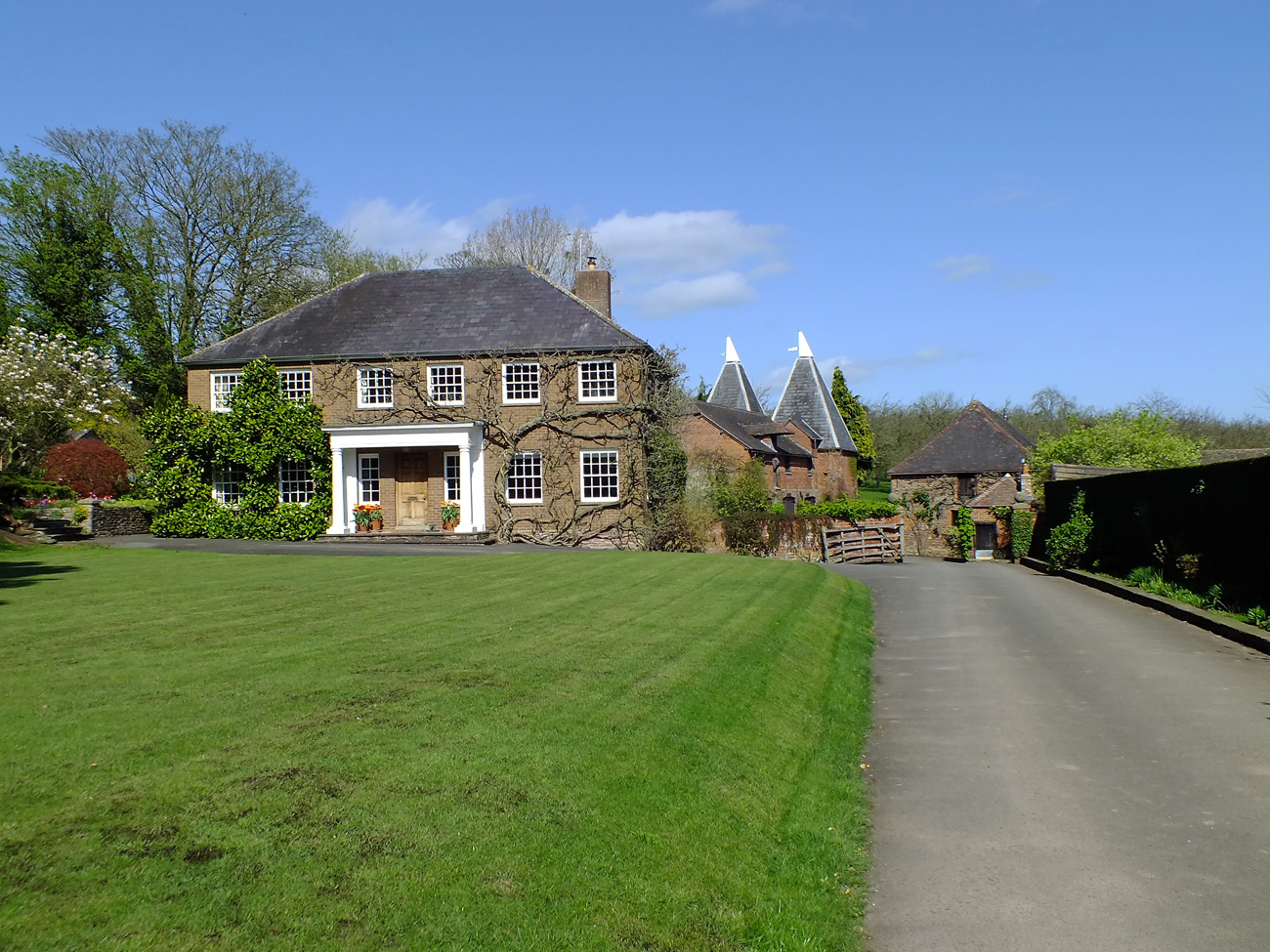 Leaving the Spring Garden behind brings you out in front of the Manor House, with pots of bright tulips outside the porch and walls festooned with budding wisteria. The Main Lawn softens the driveway which leads to the farmyard. And a barn with bells.