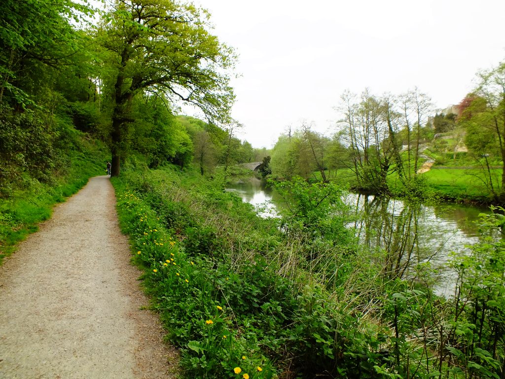 If you look ahead you can just glimpse the castle and Dinham bridge where the walk ends. It is a very short walk. Dandelions line the path here, but further on we’ll find some different wild flowers.