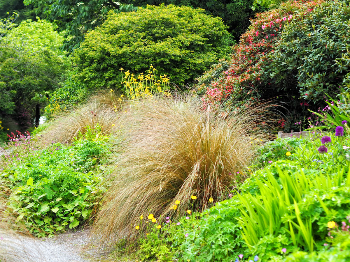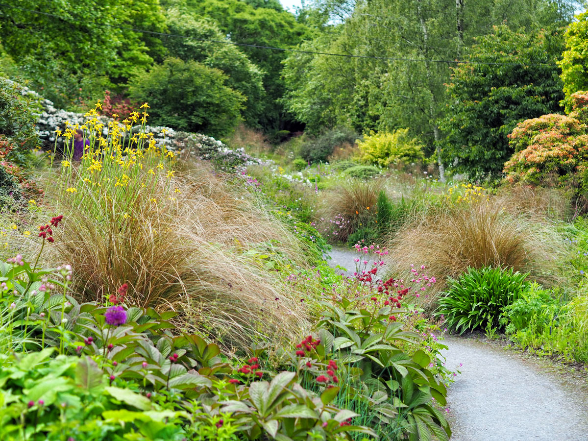 Behind the borders are more winding pathways among colourful shrubs and trees.