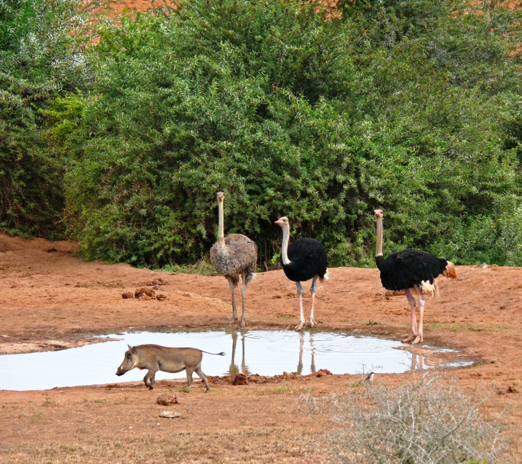 The rondavel was quite sweet – a queen sized bed, some drawers, a separate toilet and shower complete with flatty (a very large spider who eats mozzies so we left him alone) and a wash basin. There was a fridge on the stoep and a table and chairs and braai facilities nearby plus a communal kitchen. The view was idyllic – from the stoep we had a feast of kudu, warthog families, ostriches and Egyptian geese around the waterhole; there was lots of evidence that elephant went there, but sadly we never saw any visiting. That’s not to say we didn’t see any ellies though.