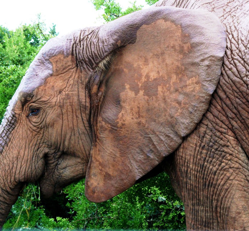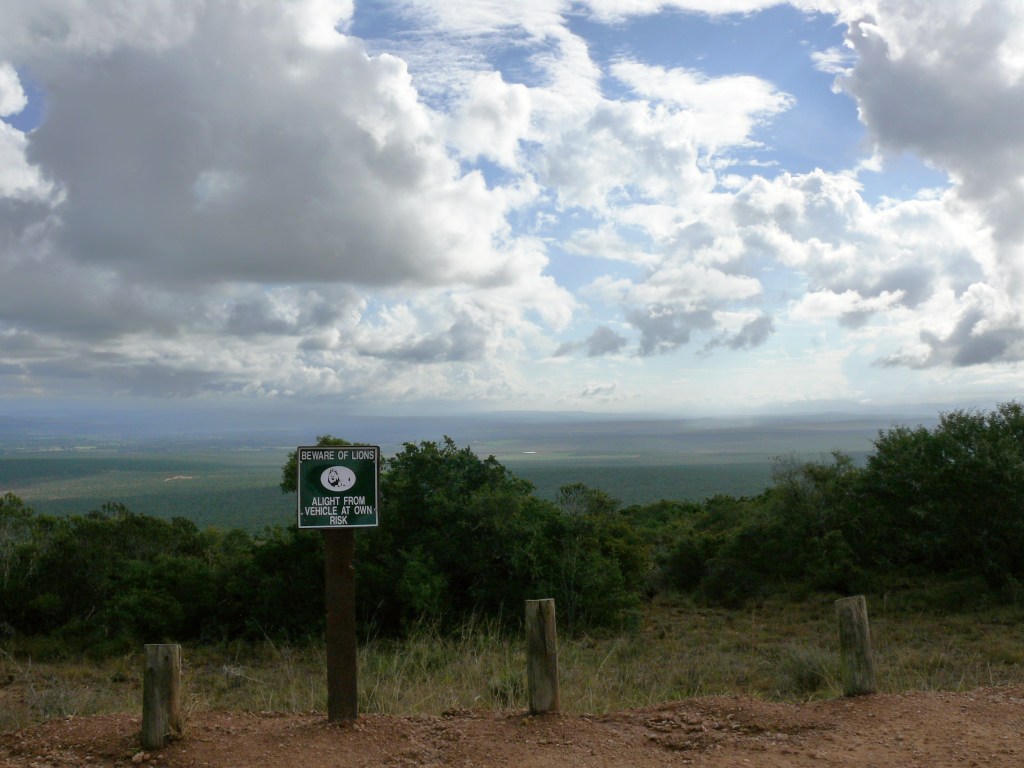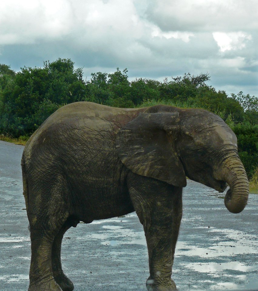 We left Knysna at around 10 am after another delicious breakfast and set off on the N2 towards Port Elizabeth. An uneventful journey apart from a heavy rainstorm near Jeffrey’s Bay and a 20 minute wait at road works. We followed the brown sign route to Addo Elephant National Park which was a bit of a strange route leading to the R335 as it took us through a township on the outskirts of PE and not a route I would have chosen myself. The sky was still heavy and we saw some dramatic lightning on the horizon, but it stayed fine. We reached the park at 2.30 pm and drove to our pre-booked little rondavel overlooking the main entrance Nyati water hole which is floodlit at night.