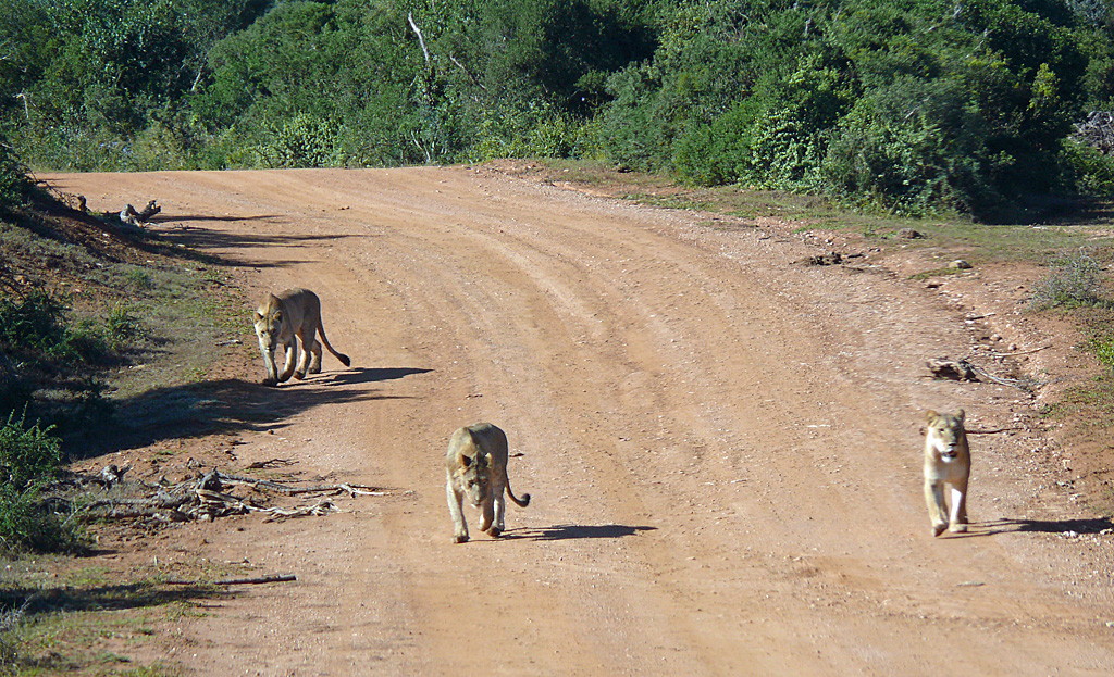 We were completely alone and they really are much larger than you think this close up. Whilst I was trying to operate the camcorder they carried on walking right up to the car and several thoughts rushed through my mind as to whether I’d heard of lions attacking a car, whether they liked or disliked the colour white (the colour of my car) and whether my collision damage waiver covered me from a dent in the roof from a large cat leaping on top, until after approximately 30 seconds I lost my nerve and throwing the camcorder to my husband, quickly put the car into reverse and retreated some metres up the road.
