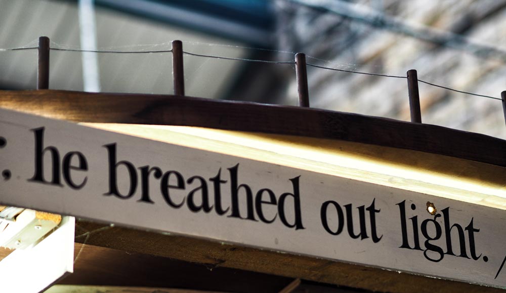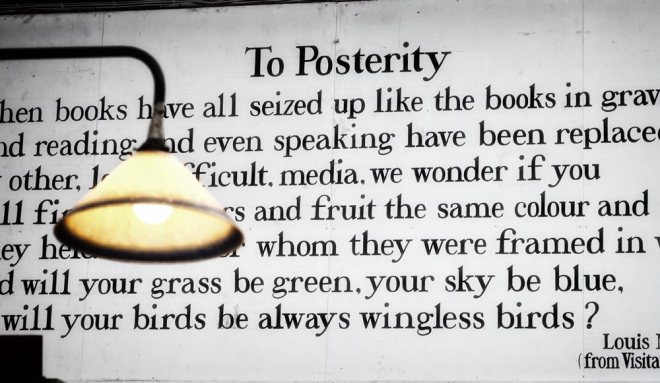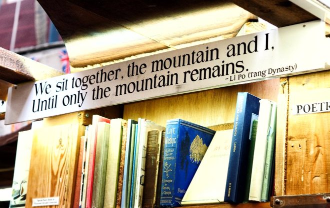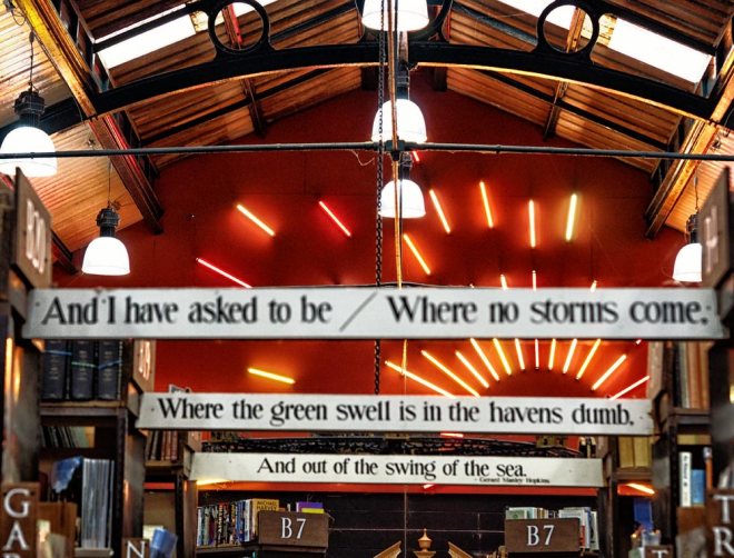 …an enchanting place filled with poetry lines linking the bookshelves above your head, 40 foot murals and a model train-set in the air; a station café, free wifi, comfortable armchairs and plenty of seating.