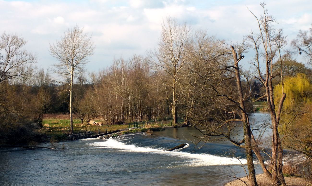 People are out an about on the Millennium Green and even playing in the water, though not yet in swimsuits. The water level is low, but the river is running fast.