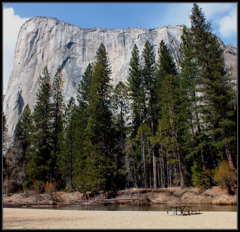 A picnic bench on Cathedral Beach, Yosemite Valley, with a view of El Capitan