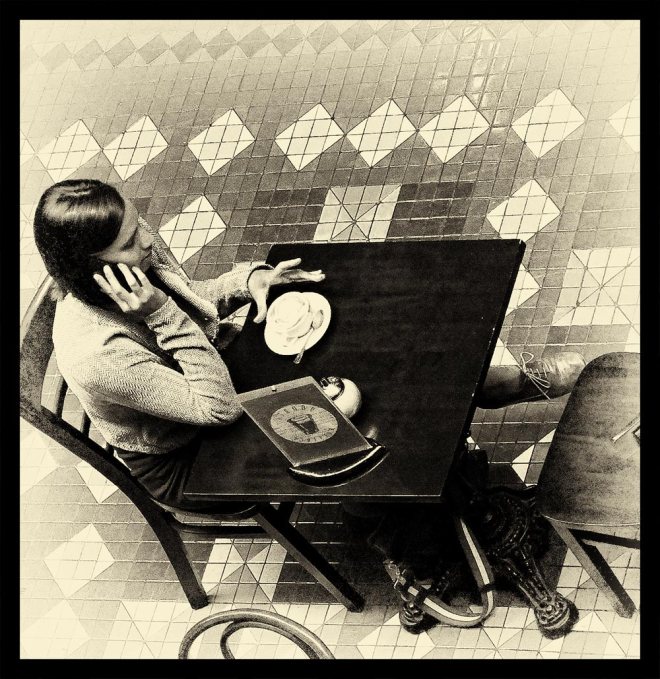 This I think is my favourite. The squares within the squares on the tiled floor; the square table with its circular base; the curve of the bentwood chair; the circle on the menu which half hides the circular 1950s style sugar dispenser; the round cup and saucer circled by her hand. And a Black and White Sunday as well.