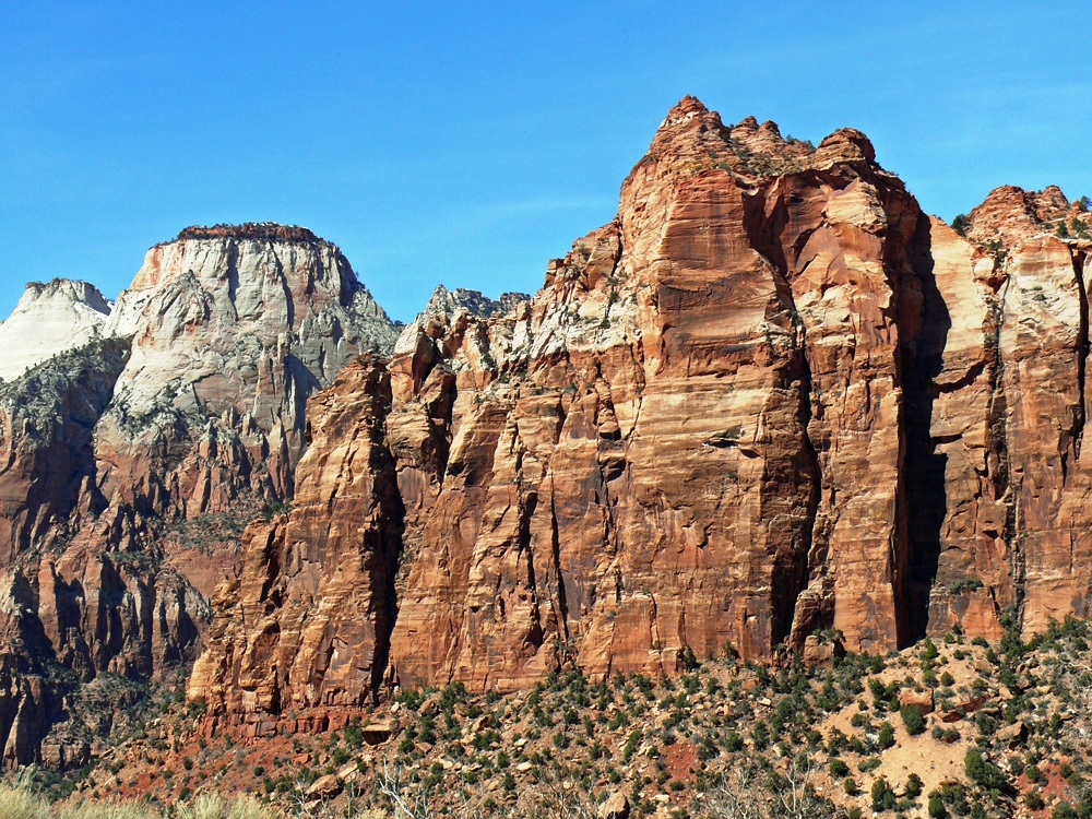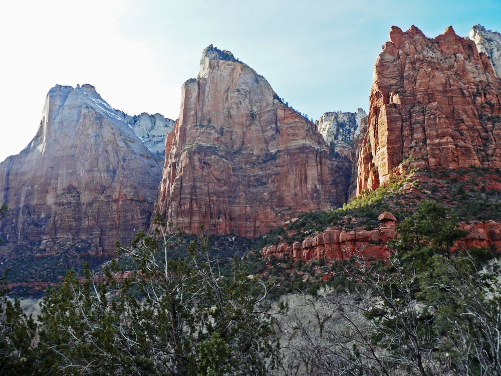 Court of the Patriarchs was named for three towering figures of the Old Testament, these sandstone cliffs hold court over Birch Creek Canyon and this section of the Virgin River. In 1916 Fisher gave the religious names to the peaks; Abraham, Isaac and Jacob.