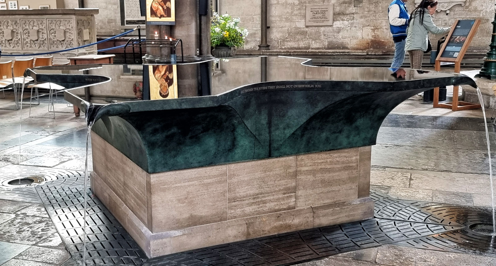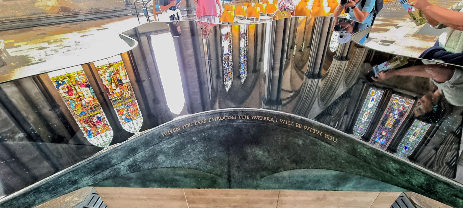 Each light shows a main figure above a related scene, and all are connected by the imagery and symbolism of water. This was, and still is, the baptistry area for the old parish church.