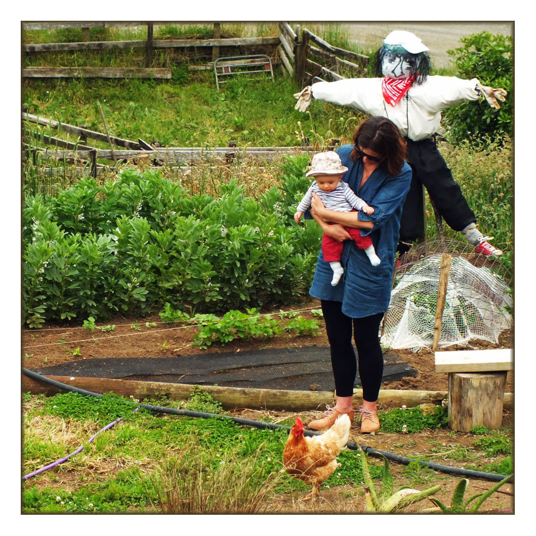 An old photo of my daughter-in-law with baby Lorenzo (who turns six today) chicken watching in her mother’s garden in Raglan, New Zealand and watched over by the wonderful realistic scarecrow. And for those of you with keen eyes you will have spotted the veggies under cover to protect them from the chickens.