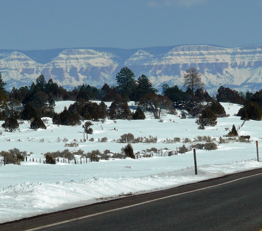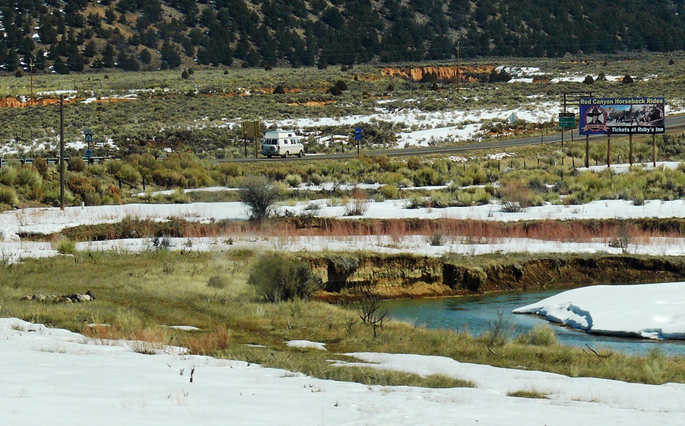 Turning south onto the 89 the Sevier River winds it way alongside, like a black snake in all the snow. Around nearby Duck Creek modern ranches stand alongside decaying remains of ancient buildings. Horses’ breath steaming in the cold. At Hatch there were loads of antique shops, and any other time we’d have stopped for a browse, but we wanted to move on to the final destination on our itinerary. Pretty stands of Aspens lined the road, pink, white and yellow twiggy branches in the air.