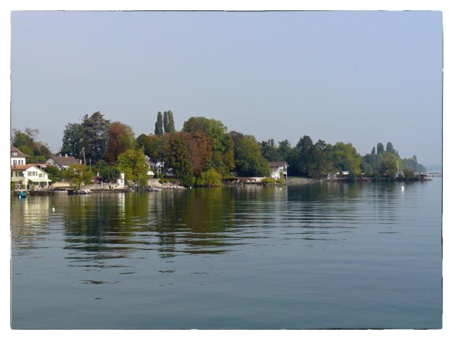 Sleepy boats tied to wooden jettys belonging to millionaire’s houses on the shoreline. Autumnal tints in the trees. A white swan at Coppet. Straight lines of vineyards on the hillside.