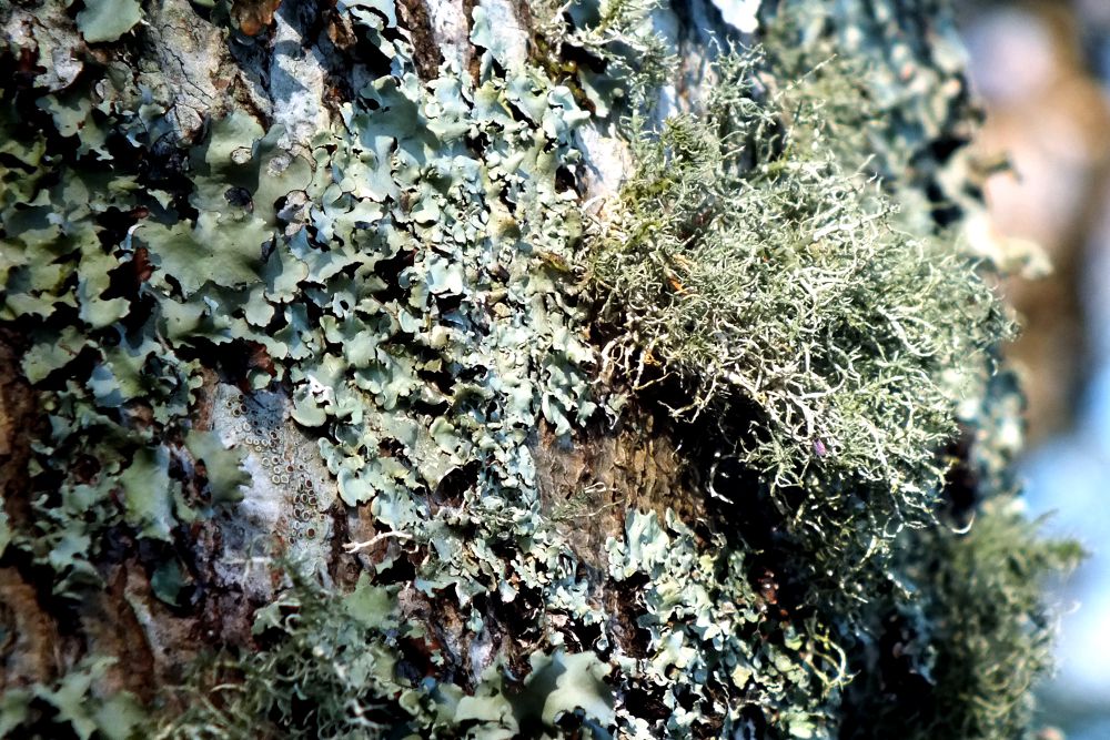Suffice to say that lichens are living organisms and there are several types. The yolk-yellow crusty ones are crustose, and some are crustose placodioid as the pattern spreads out from the centre like those blue-grey ones; those on trees tend to be foliose or fruticose, the latter being like a mini shrub. And then you get the dusty powder sort that you find on rocks which is called leprose lichen.