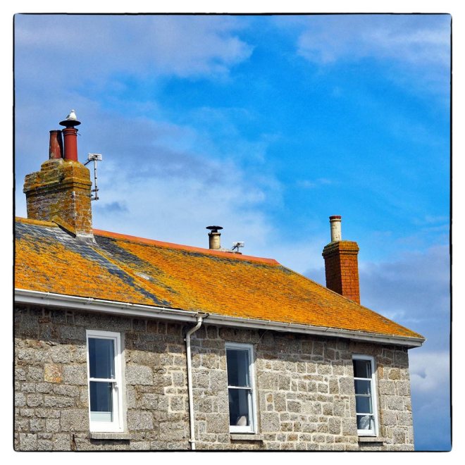 Today I am focussing on colour. Yellow is one colour that I associate with Cornwall. The bright daffodils dancing in the fields in early spring; the deep golden gorse in early summer; yellow sandy beaches contrasting with the blue sky and blue-green sea and the wonderful yolk yellow/orange lichens on roofs and walls creating living intricate textures and patterns. (please click image to enlarge)