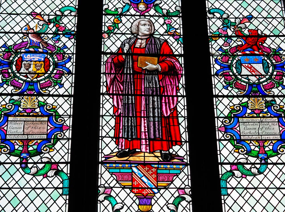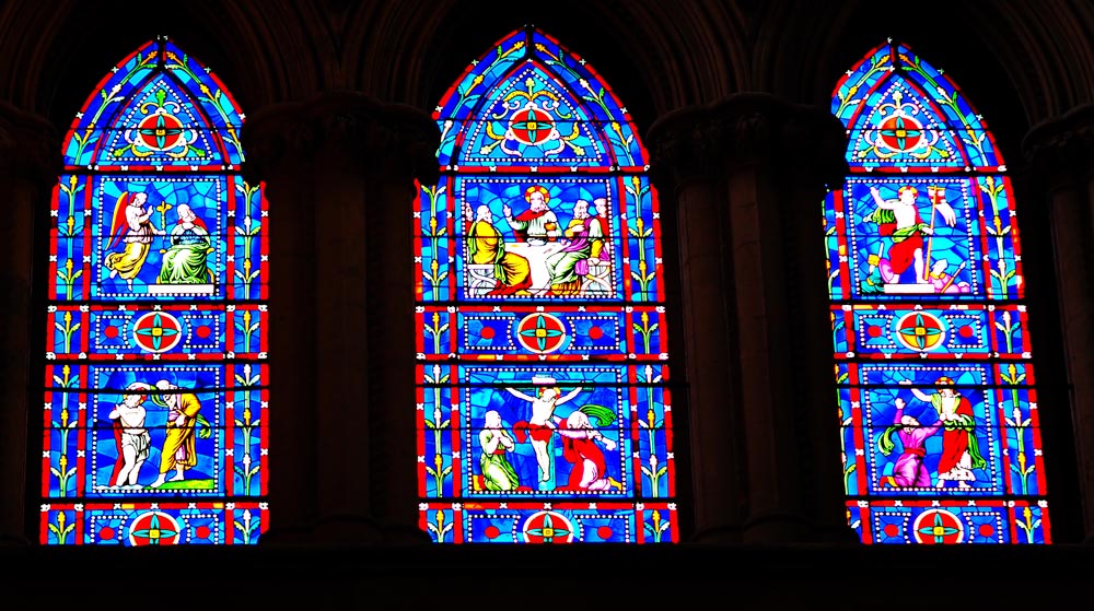 The Great East Window was only the second nineteenth century window to be installed in the cathedral and subject of a great debate. Such is its size that it is not possible to photograph it without tilting the camera upwards – hence the peculiar angle.