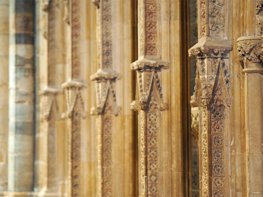 An arcaded passageway leads to the chapter house. This has darker columns with carved capitals of foliage set under pointed arches (as in the first image and below).