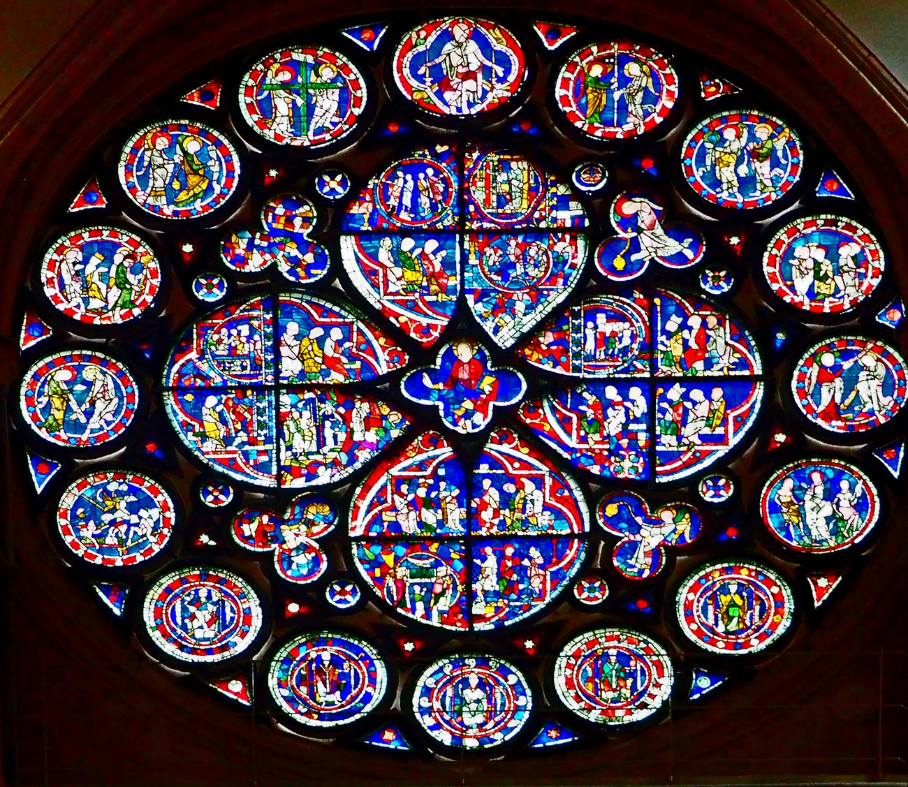 To the south is the Bishop’s Eye filled with a kaleidoscope of ancient glass. It was most likely rebuilt circa 1325–1350 after the completion of the Minster and shows the beginning of the decorated style with the flowing tracery representing leaves – a unique pattern.
