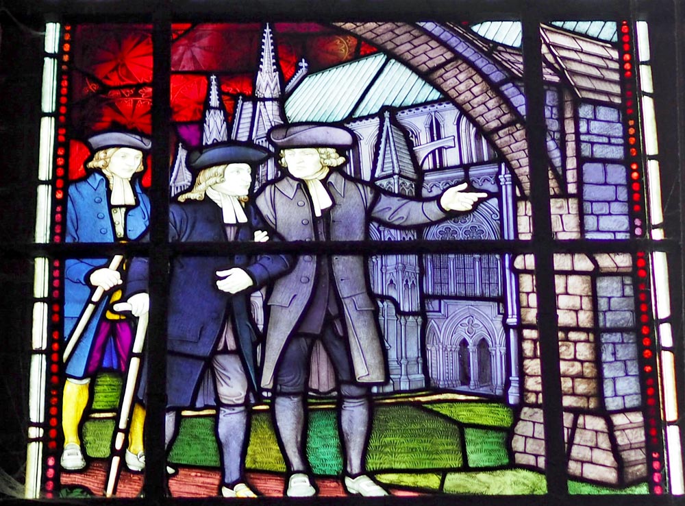 Below, Dean Kaye escorts John Wesley on his last visit to Lincoln Cathedral in 1799 (Clayton & Bell 1909) in the Chapter House.