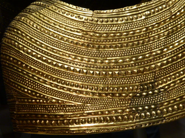 (Above) A close-up of a gold cape from Mold, Wales made from a single sheet of gold (c 1900 – 1600 BC)
