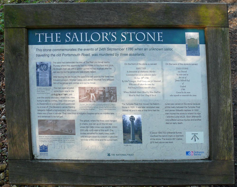 This stone commemorates the events of 24 September 1786 when an unknown sailor travelling on the old Portsmouth Road was murdered by three men.