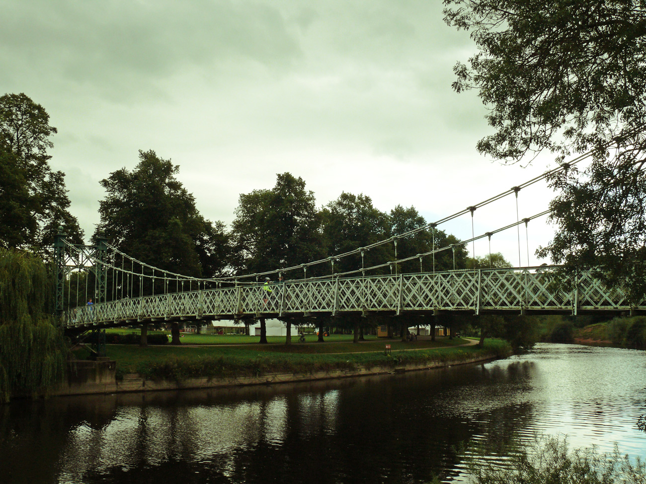 Above (header) is a photo of the Boathouse. It is situated on the fringes of Frankwell and Kingsland, beside a recently refurbished foot-bridge (below) that carries walkers into Quarry Park. In mid summer the patio buzzes with joyful chatter and clinking glasses as patrons sit with a view across the Severn as it snakes its way through the town. Surprisingly there aren’t many pubs by the side of the river and this is probably the best.