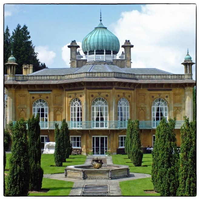 This extraordinary Indian house set in the Cotswolds hills has a central dome, minarets, peacock-tail windows, jail-work railings and pavilions. The main photo above shows the curving Orangery which frames the Persian Garden of Paradise with a fountain and canals. A more in depth post about the gardens is on my flower blog: Earth Laughs in Flowers
