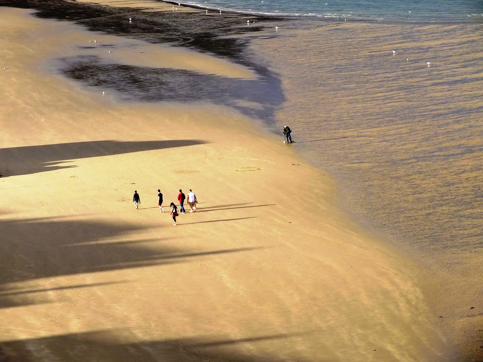 Hotels and houses clinging to the edge of the cliffs, yachts floating in the harbour and long evening shadows of people walking at the edge of the sea. Could be the Mediterranean.