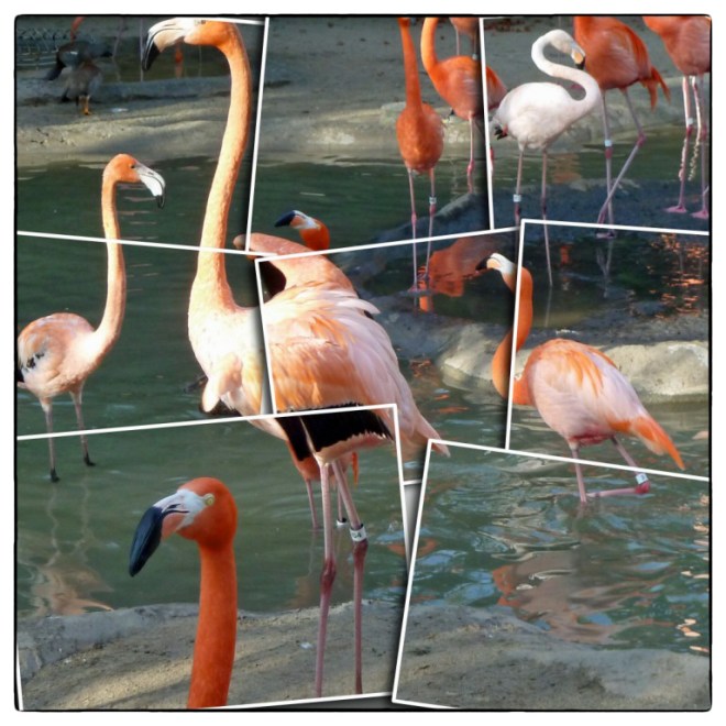I was tickled pink to see these pretty salmon-pink flamingos with their pink legs enjoying life in San Diego zoo.