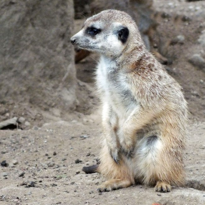 A “kat” is not a “cat” when it’s a meerkat, a vital, clever, and amazing weasel-like animal that is a member of the mongoose family. Meerkats have scent pouches below their tails and rub these pouches on rocks and plants to mark their territory. The territories of different meerkat mobs often overlap, resulting in constant disputes. Usually, a lot of aggressive posturing and bluffing precedes any physical contact. (Remind you of anyone?)