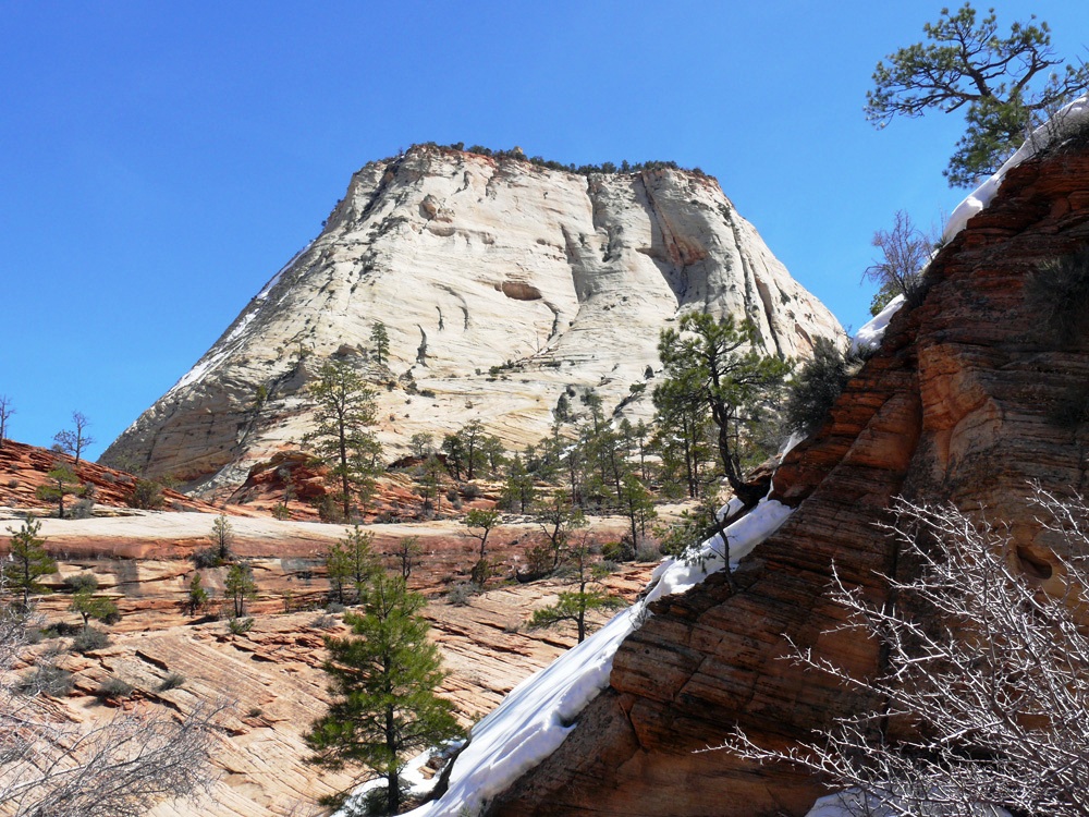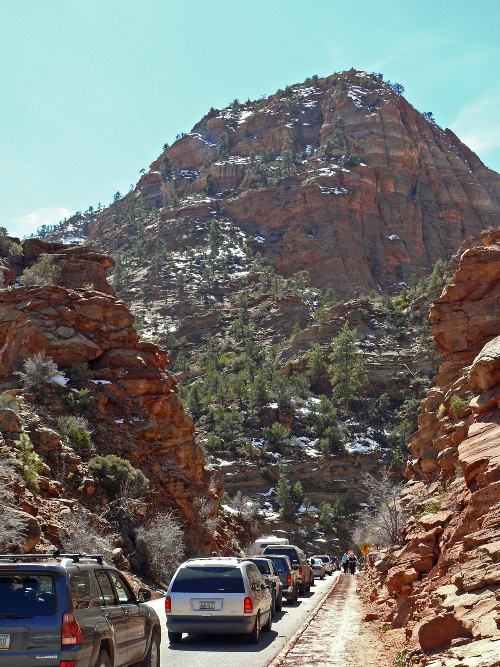 In the afternoon we returned to the park and drove along the Scenic Floor of the Valley Road stopping at various places along the route, including the Emerald Pools Loop, Angels Landing and Temple of Sinawava. The Emerald Pool was very disappointing, after following a rather icy trail I reached the first pool (puddle) which was a muddy brown. The trail continued underneath a dismal waterfall onto even more uneven ground at which point I turned back.