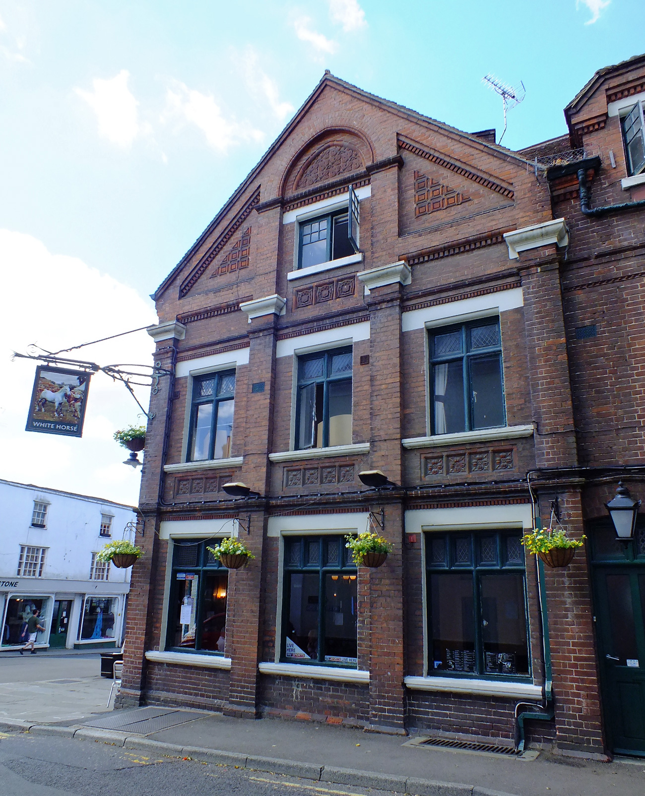 Stop to look at the decorative bricks of the White Horse public house on the corner.